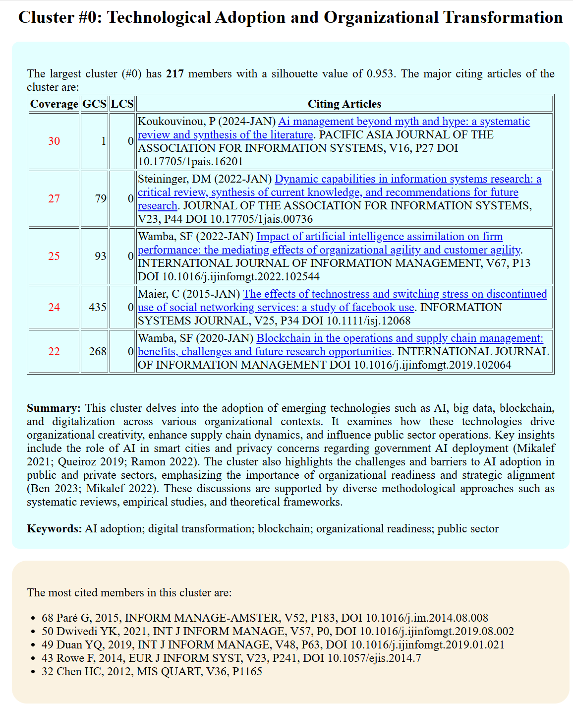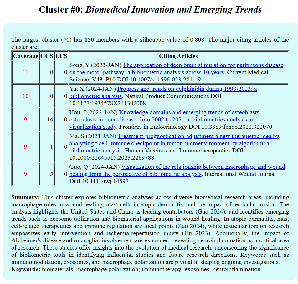 The new version of a cluster summary highlights key themes along with citations to specific and highly cited citing articles (wordy but precise) to support the summarization points. These cited articles provide convenient stepping stones for further and deeper exploration of the cluster.