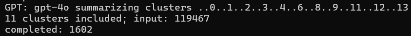 It would be indeed challenging to run this function with 500 rpm. On the other hand, your account's rpm will increase as your mileage/usage grows. Summarizing multiple clusters altogether is intentional so that the GPT model can take all thematic variations into consideration and better characterize each cluster in the same broader context. I will bear in mind the need to work with the rpm constraints. In the meantime, you may try various configurations of your project and work with a smaller network to begin with, for example, project properties: LRF=2; LBY=5; e=3.0; g-index (k=25). I hope this helps.