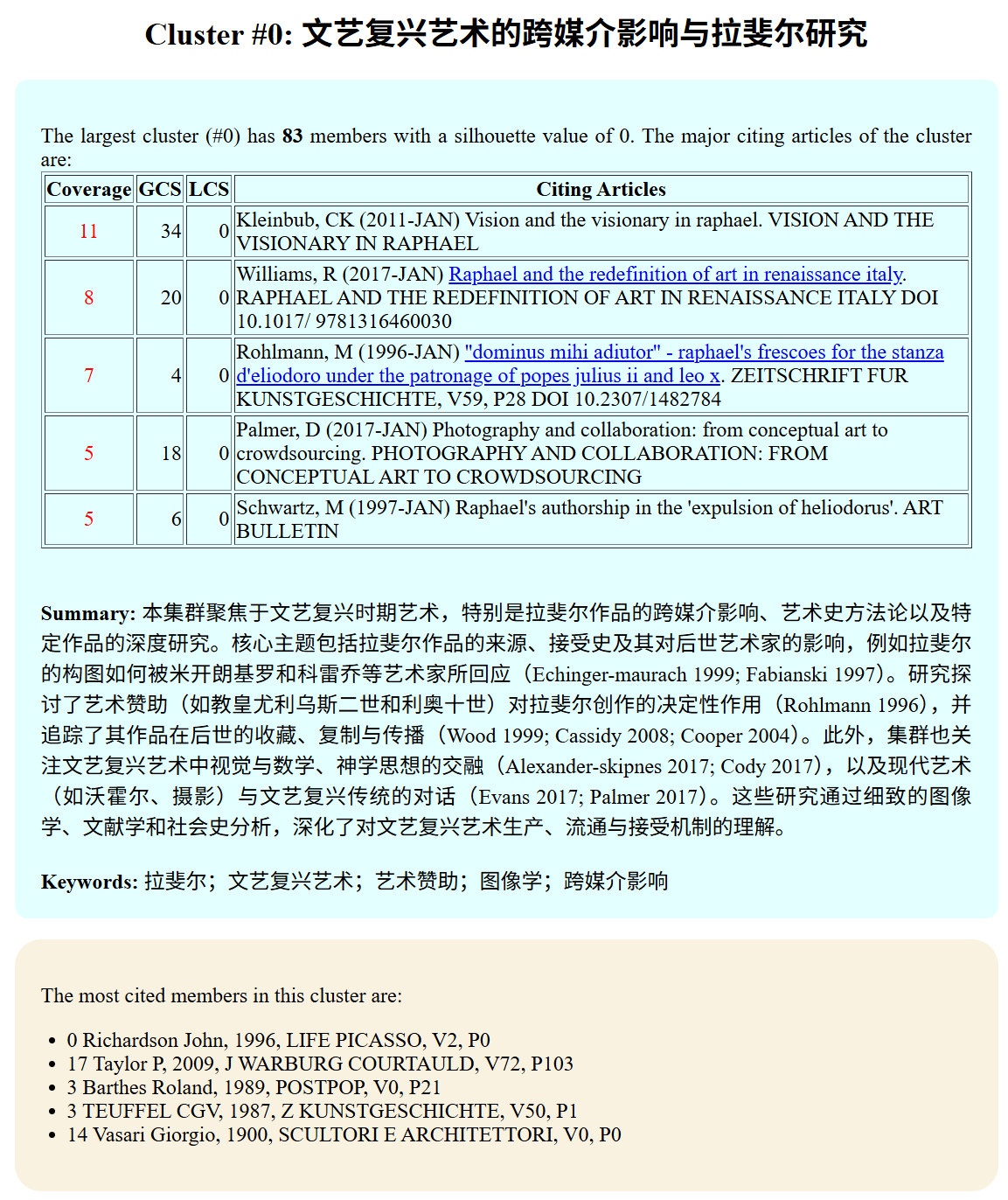 Once the cluster summarization is completed, you can use the Summary Report function to inspect major clusters in terms of what they are about, key contextual information such as major citing works, and the most frequently cited works as the intellectual basis of the cluster. Major themes in each cluster are highlighted and synthesized along with the most representative citing articles.