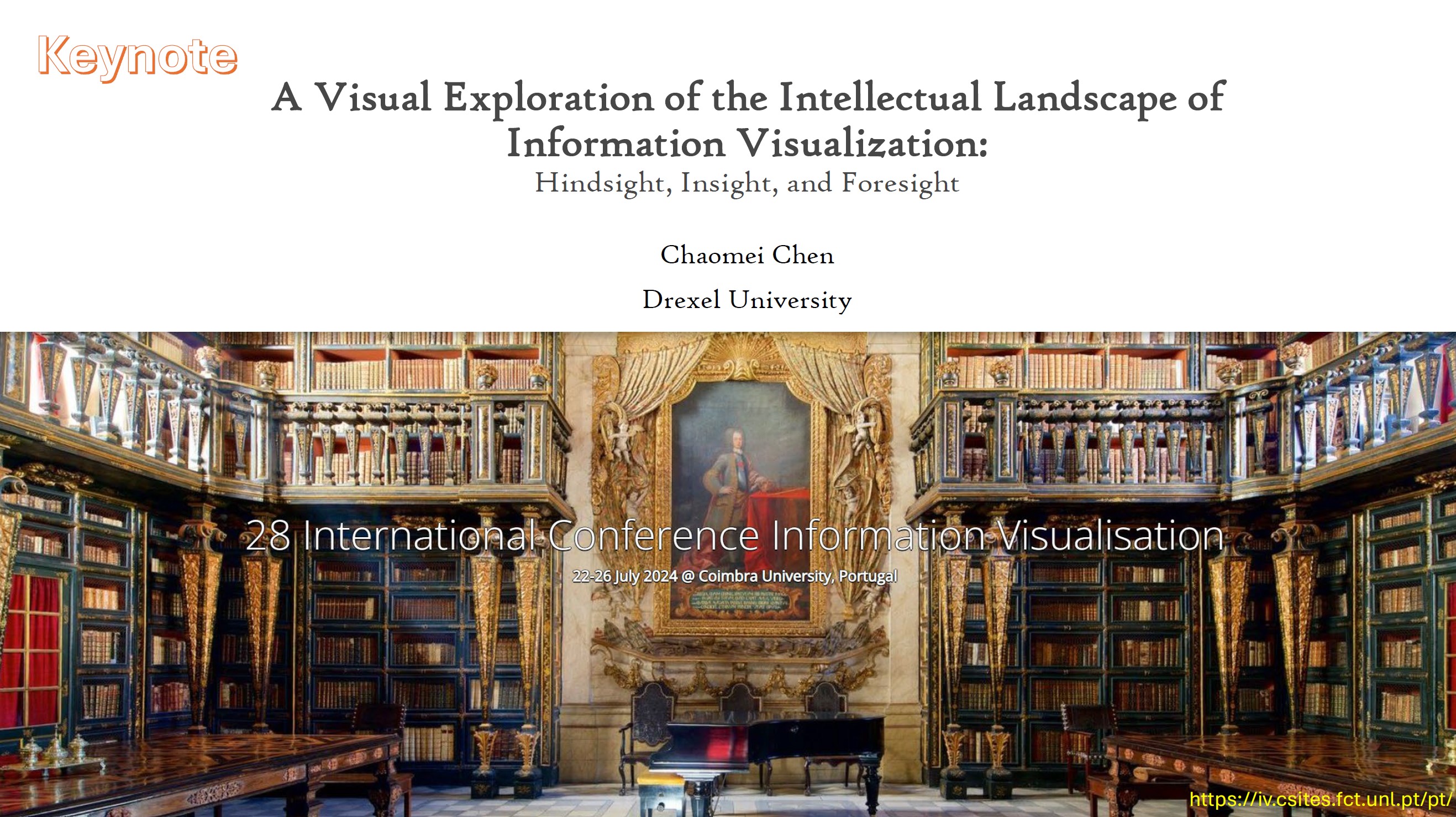 Here are some highlights of my keynote speech on July 24, 2024 at the 28th International Conference on Information Visualization in Coimbra, Portugal. The focus was on the hindsight, insight, and foresight one may learn about the development of the field of information visualization and visual analytics based on the relevant scholarly literature published between 1991 and 2024. You can download the slides with this link https://doi.org/10.13140/RG.2.2.21672.17929