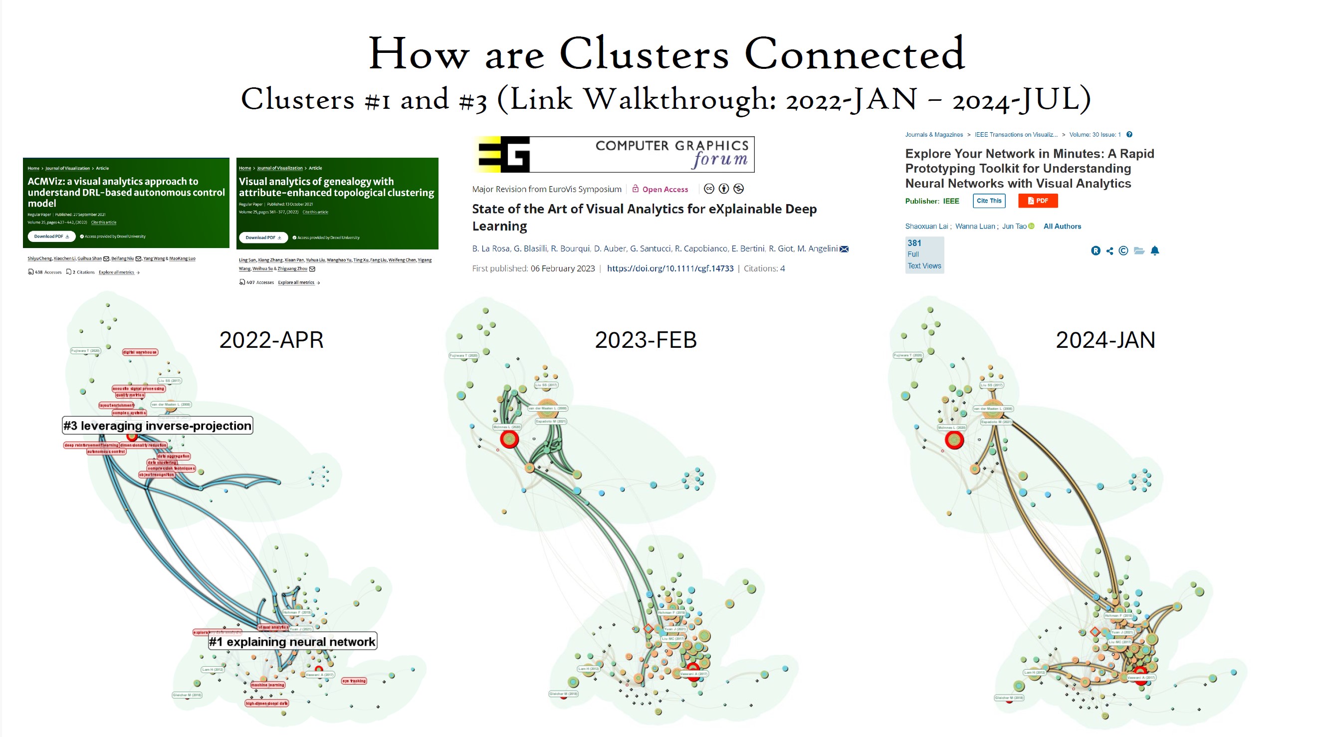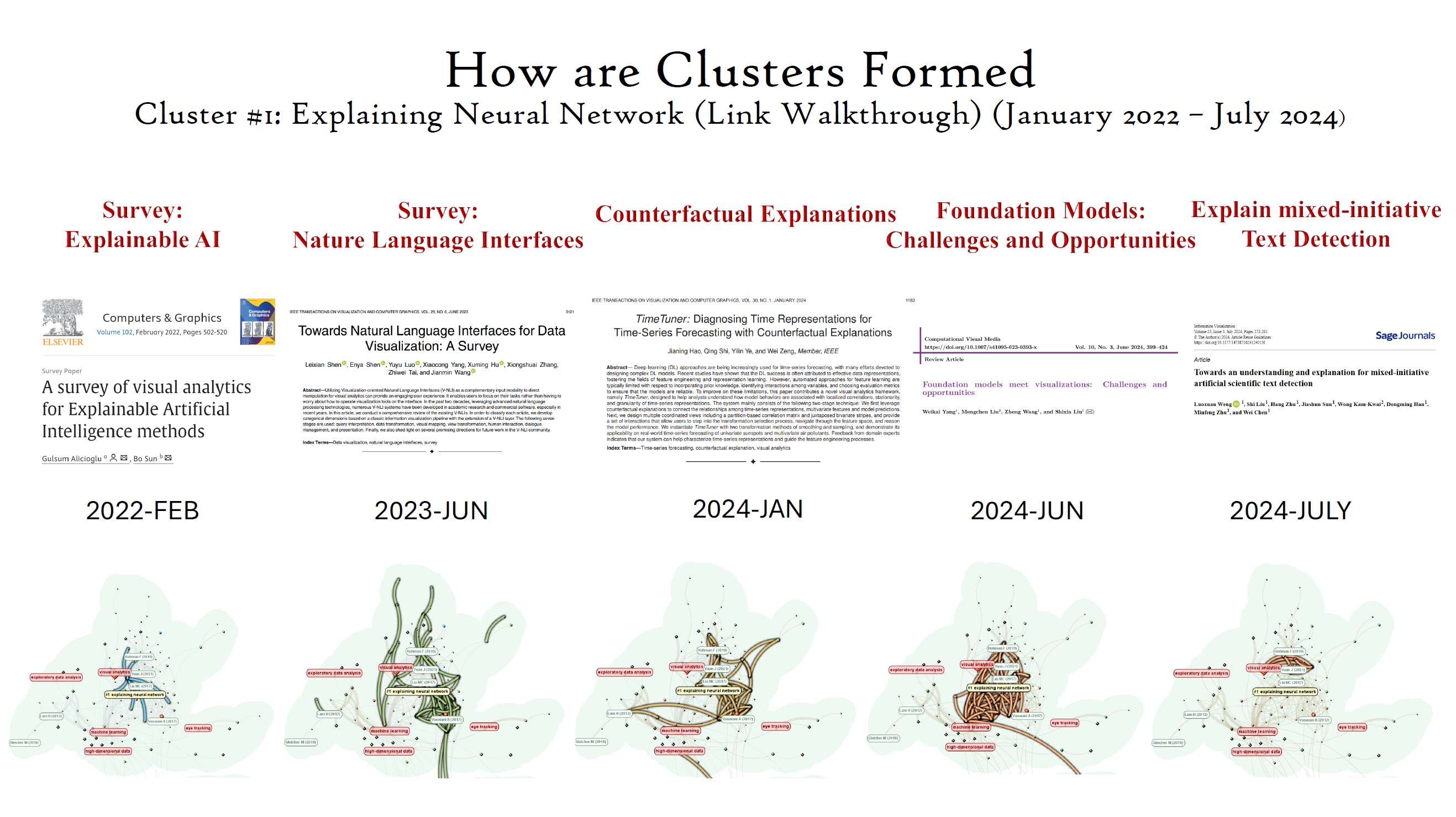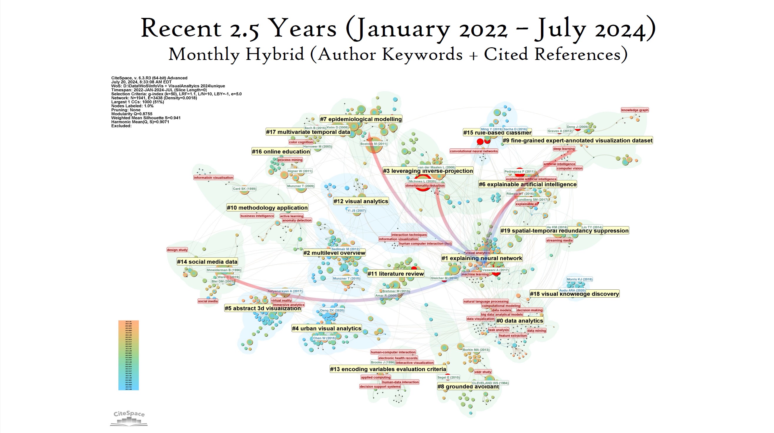 Here is an overview of the intellectual landscape of the field. Note the 1991-2004 was a typo, it should be 1991-2024. The largest and the long-lasting cluster is #0 Visualizing Multidimensional Data (in red). The prominent and the fitting theme is Dimensionality Reduction with the two very powerful and popular solutions, namely t-SNE and UMAP. The youngest cluster is #3 Machine Learning, which featured themes such as Deep Neural Network, Explainable AI, as well as tools such as Scikit-learn and TensorFlow. Multiple cluster-dependency arrows point to 6 other clusters, indicating how this relatively new cluster is drawing valuable information for previous works in these areas.
