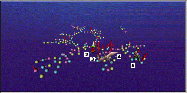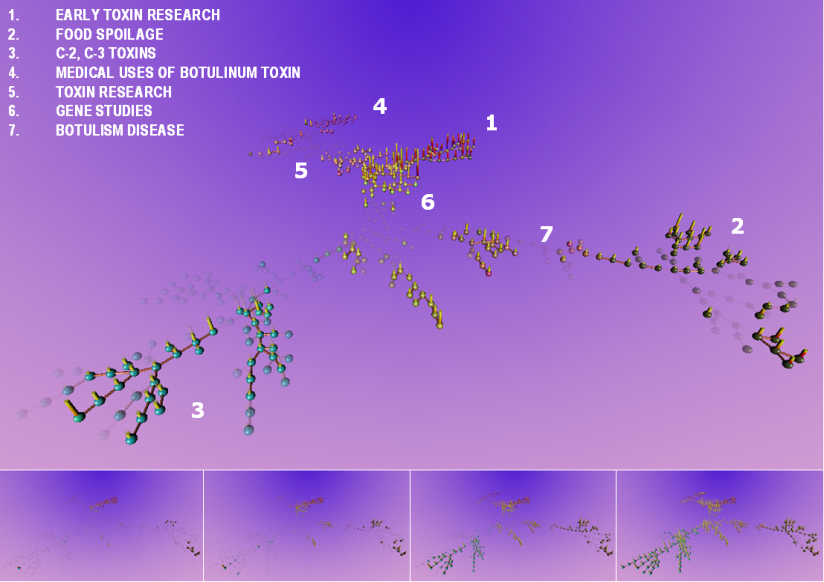 VRML models can depict the lifecycle of a publication, from its pre-publication state to its post-publication life and how fast/slow it gets citations. Of course, as we know, some publications may attract no citations for a very long time or never. VRML models allow us to play back the development of the landscape of a research field over time. An interesting and recurring pattern across several different research domains emerged. Early developments often appeared initially at the outmost branches of a Pathfinder network, for example, in areas marked as 1, 2, and 3 in the figure below. Subsequent publications tend to fill up the gaps and voids closer to the center of the network as the time went forward (for example, gaps marked as 4, 5, 6, and 7. Eventually, the central area would tend to be not only fully consolidated but also attracted the most volume of citations.