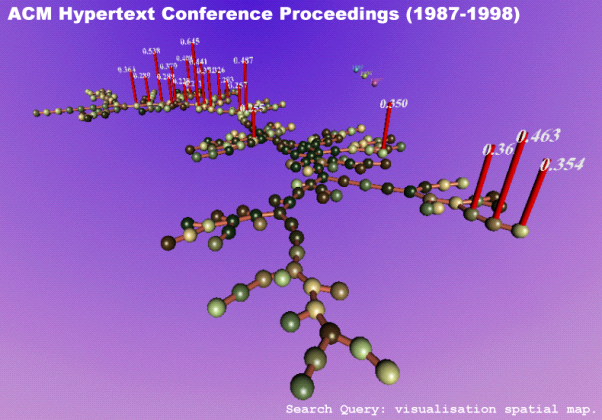 I explored this idea further in collaboration with Katy Borner (Chen & Borner 2005). We studied how users explored research literature of information visualization in a virtual world: how long did they stay in one place? How did they move in the virtual world with reference to the relevance of publications nearby?