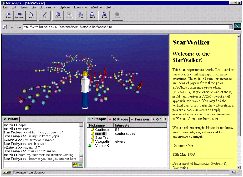 Back to 1997-1999, VRML and multiuser virtual environments were popular. Browsers such as Netscape were VRML-friendly. Another natural step was to embed a virtual world model in a multiuser virtual environment so that multiple visitors may explore the virtual world together. Instead of relying on the gravity to hold things together in the real world, in our virtual world the idea was to attract visitors with the semantics of the underlying publications. The semantic concentrations mimic stars and galaxies in our universe, while space travelers, semantic explorers, or, as Vannevar Bush called it, trailblazers can navigate freely and pursue their interest in a virtual universe - hence the name StarWalker. I wasn't aware of anyone called SkyWalker until later at a Hypertext conference.