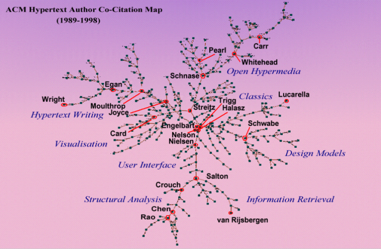 Chen C, Carr L (1999) Trailblazing the literature of hypertext: author co-citation analysis (1989–1998). Proceedings of the tenth ACM Conference on Hypertext and hypermedia: returning to our diverse roots: returning to our diverse roots. pp. 51-60.