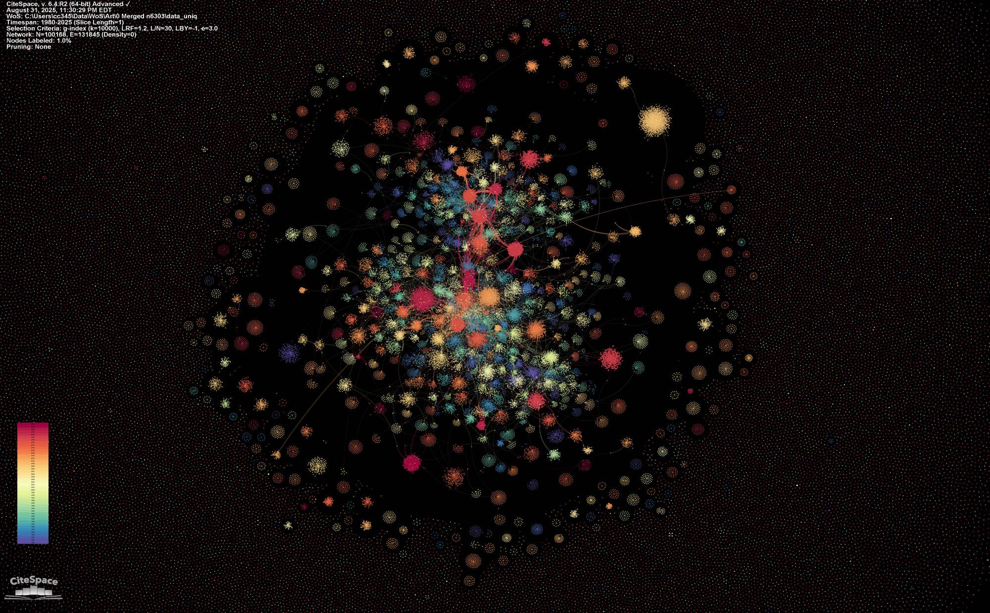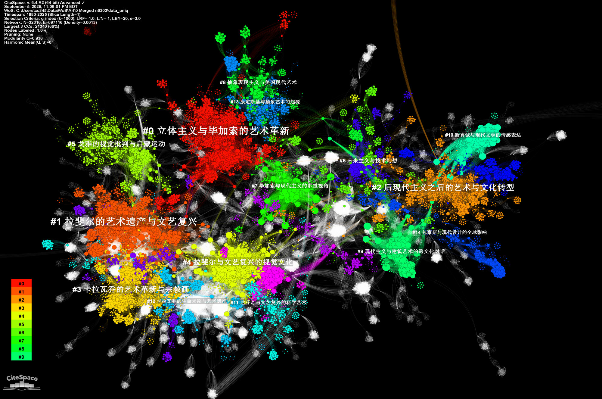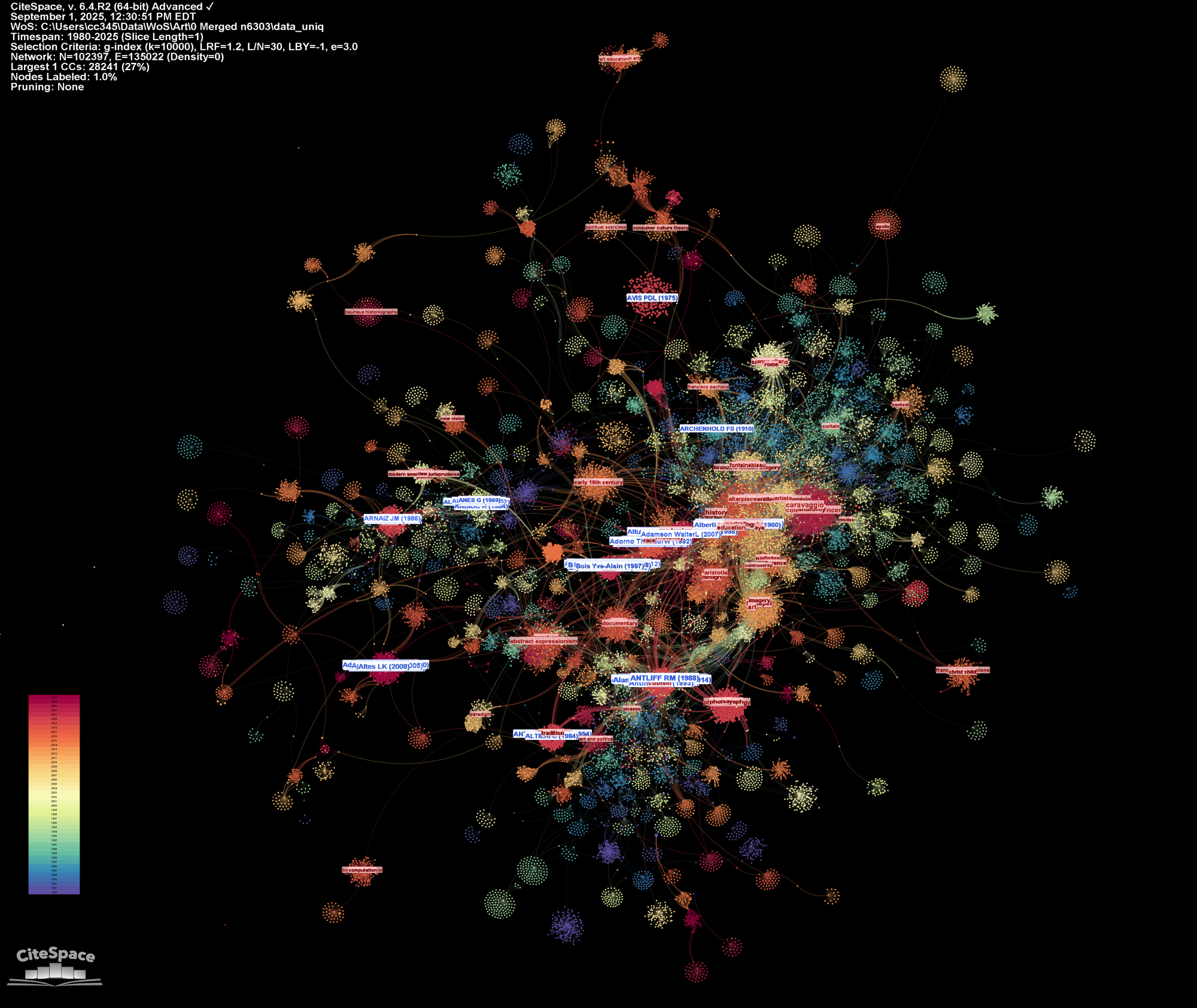 Let’s start with some important properties of a co-citation network. As with any large network, the large connected component is usually the center of the analysis. As you can see in the following example, the large connected component is where the most interesting things take place. It has a rich structure. It is also dynamic, which means if you take a look at it at difference times, you may see significant changes in its structure sometimes as well as relatively stable structure in other times. In this blog, I used a dataset of art literature for the numerous rises, falls, spirals, and come-backs of different kinds of techniques, styles, appreciations, and critiques. The entire network features 100,168 cited references and 131,845 co-citation links. The numerous singleton nodes floating around the center stage are conventionally outside the scope of our concern.