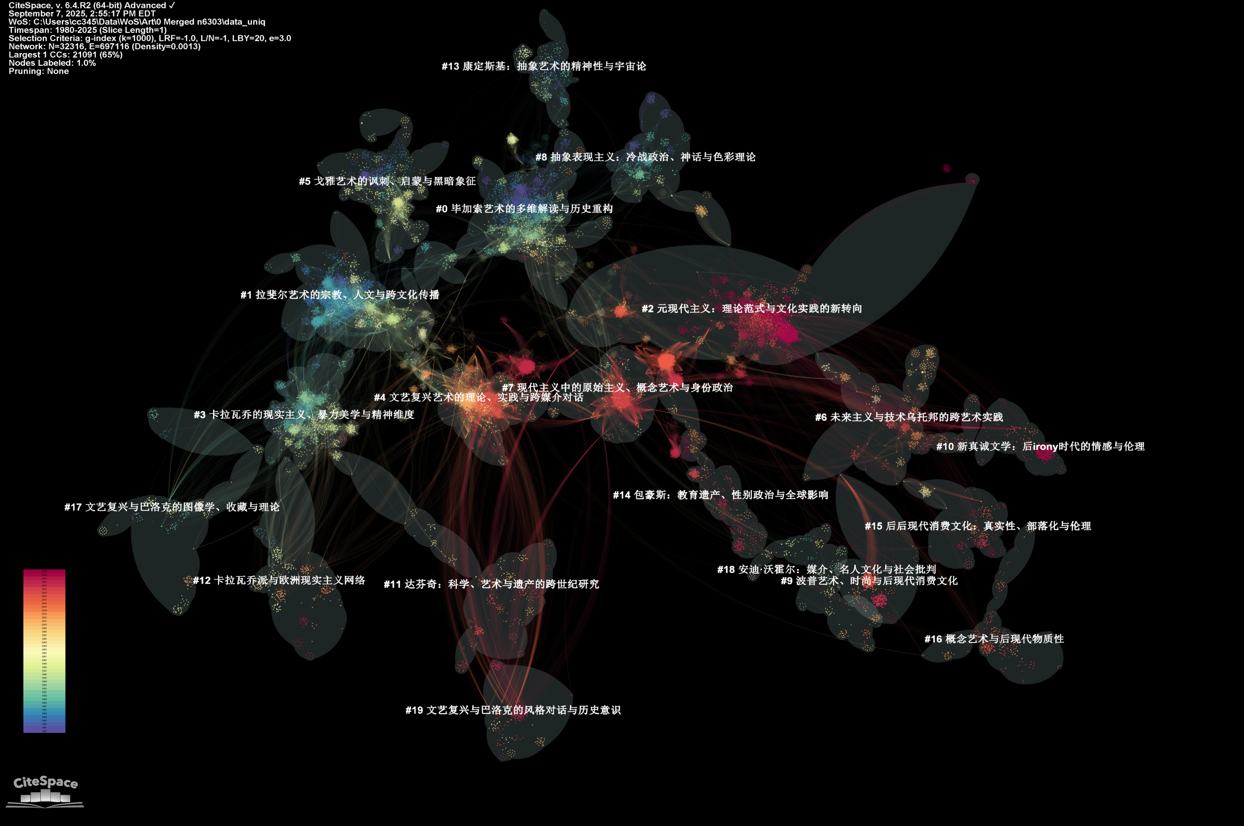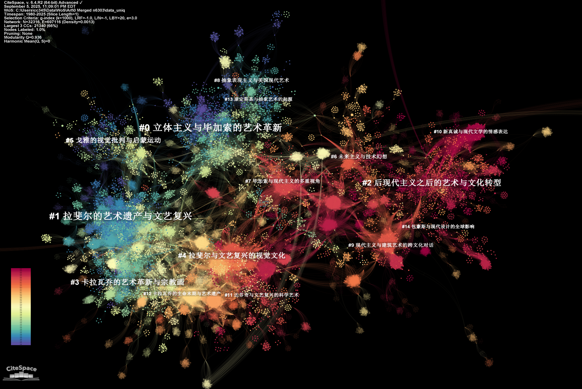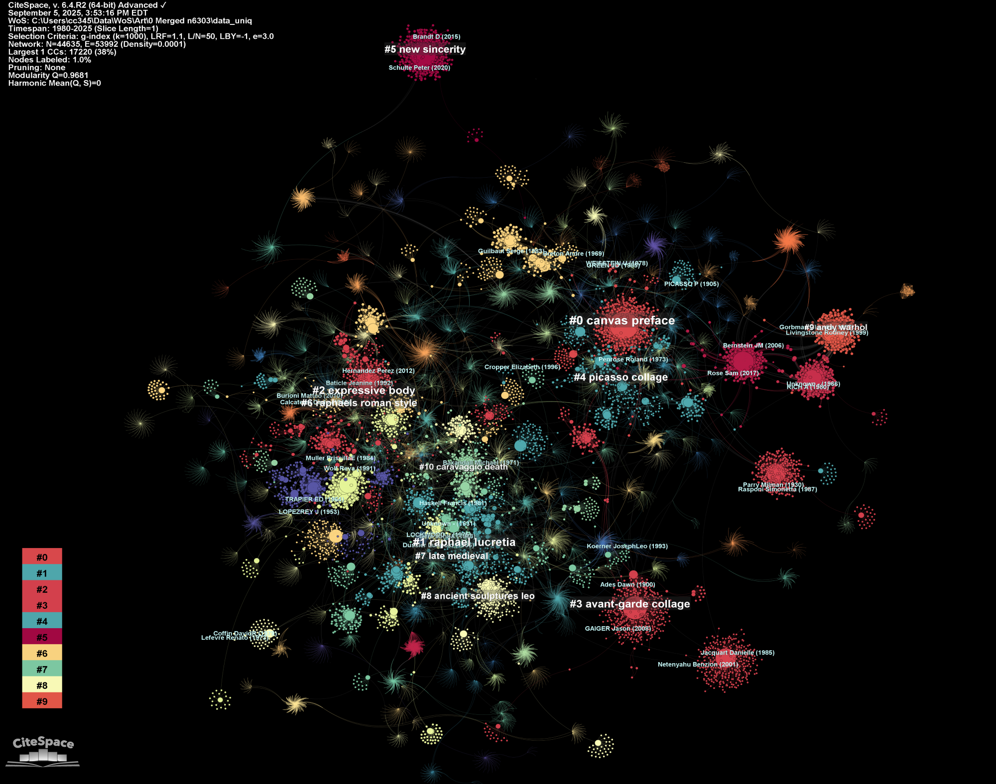 Let’s start with some important properties of a co-citation network. As with any large network, the large connected component is usually the center of the analysis. As you can see in the following example, the large connected component is where the most interesting things take place. It has a rich structure. It is also dynamic, which means if you take a look at it at difference times, you may see significant changes in its structure sometimes as well as relatively stable structure in other times. In this blog, I used a dataset of art literature for the numerous rises, falls, spirals, and come-backs of different kinds of techniques, styles, appreciations, and critiques. The entire network features 100,168 cited references and 131,845 co-citation links. The numerous singleton nodes floating around the center stage are conventionally outside the scope of our concern.
