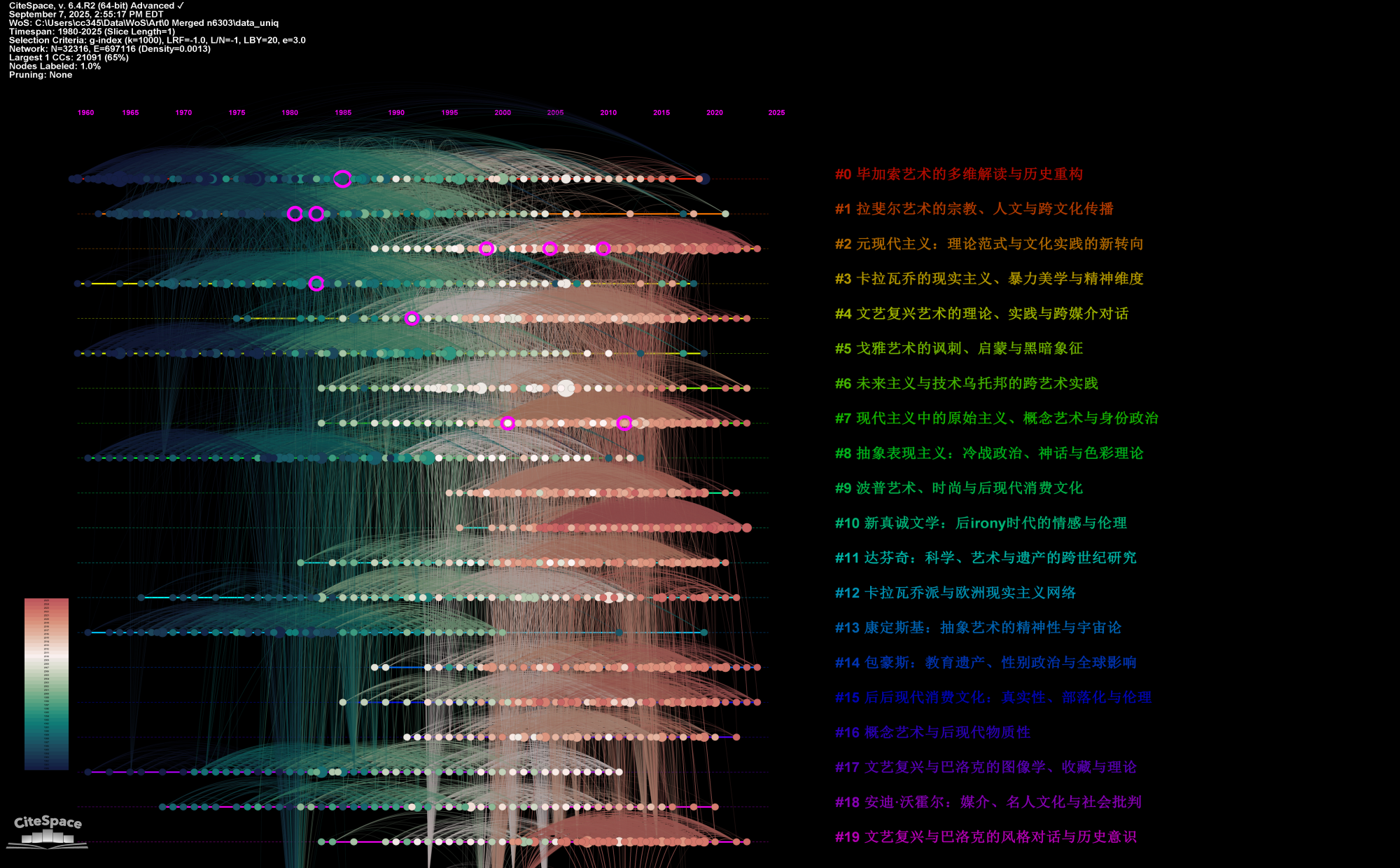 The average age of a cluster gives us some idea when it was essentially formed or peaked. A few clusters had their high time in early 1980s. Similarly, a few clusters were concentrated around 2012. From the landscape view and the timeline view below, we can easily tell which cluster was formed most recently and which one emerged first.