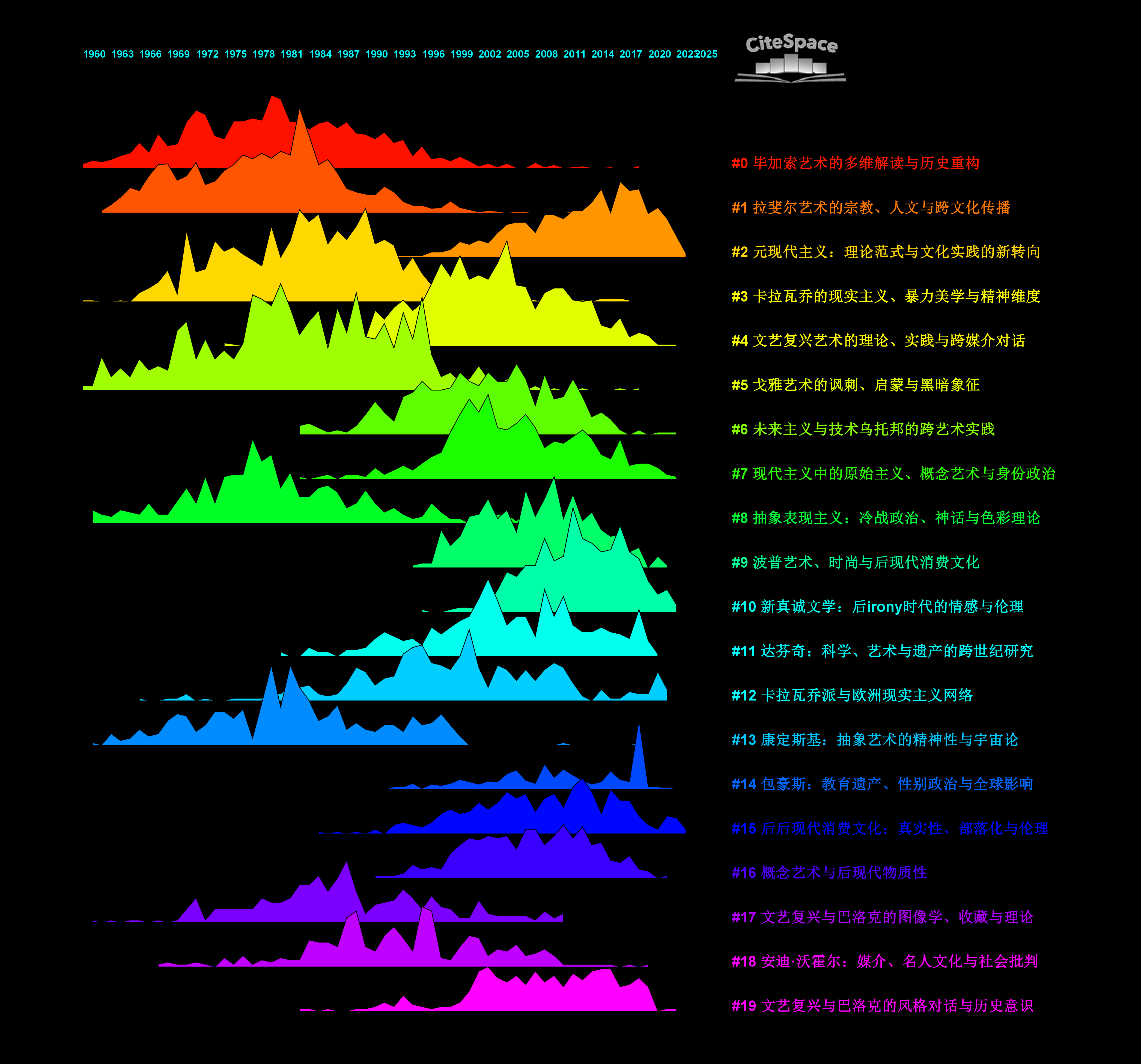 For example, although Cluster #0 is the largest cluster, it is no long a significant player in the most recent years. In contrast, Clusters #2 and #10 are going strong, while Clusters #4 and #7 are reaching their final stage.