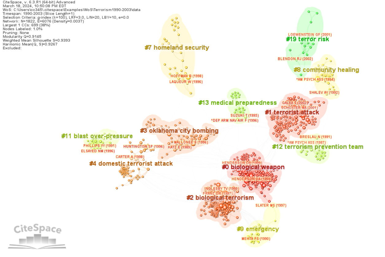 Finally, this is the time-slicing version of the network. The largest connected component contains the same number of cited references, but the clusters they form significantly differ from the non-time slicing version. It captured some of the larger clusters that were absent from the non-time slicing version, namely, biological agent, national threat, and mental illness.